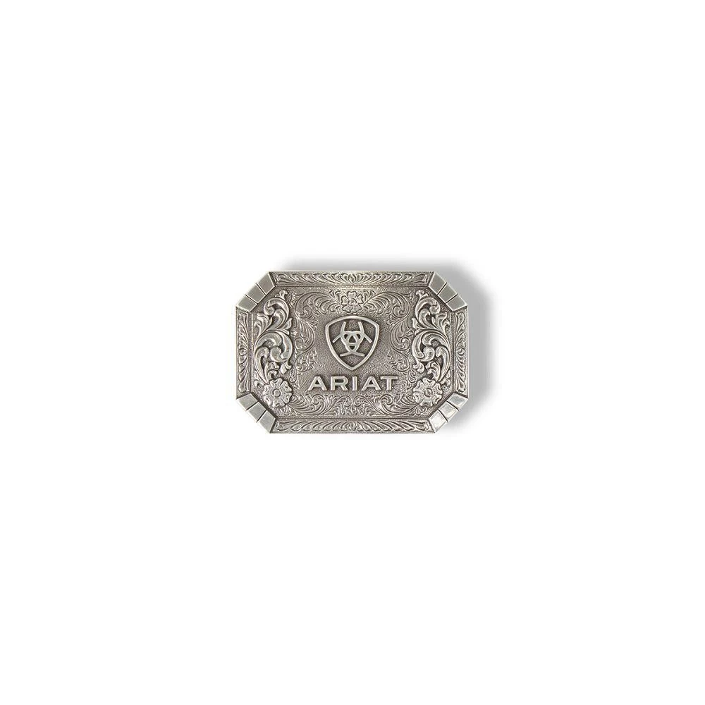 Great Ariat buckle by M&F Western Products. Rectangle with a western floral engraving around the Ariat emblem. Antique silver finish.