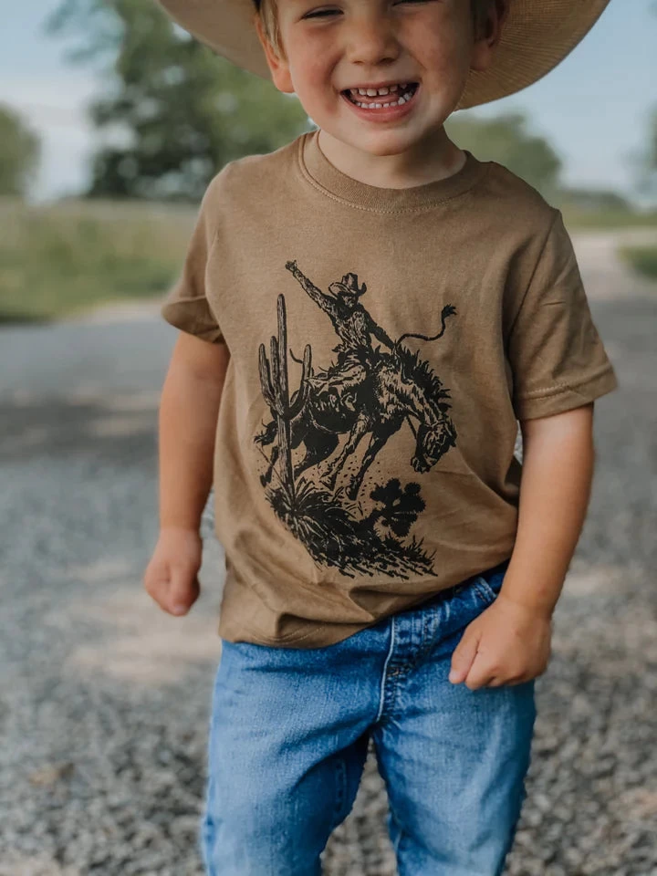 Grab this hand-drawn Southwest Bronc tee in either Coyote Brown for your cowkid! There’s nothing punchier than a hand-drawn cowboy! These are unisex fit and look great