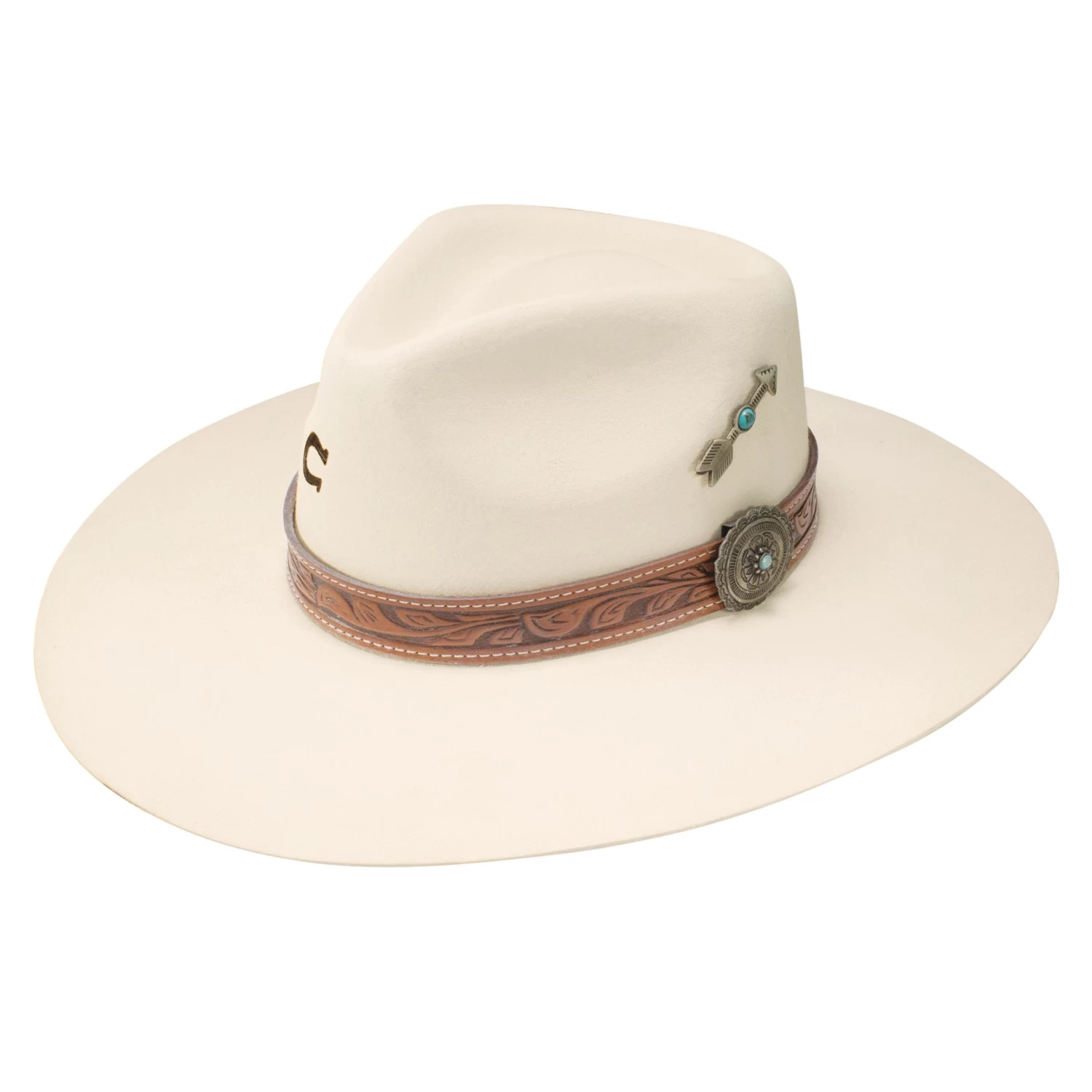 Charlie 1 Horse White Sands with a pinched rancher style 3 3/4″ Flat Brim and Leather Tooled Band – Ivory