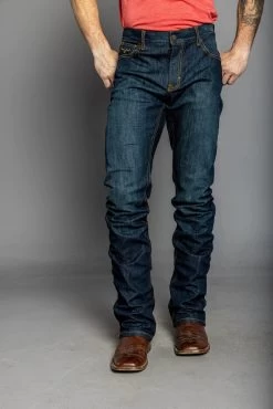 The Roger is a modern take on a classic cut jean featuring a lower rise and slimmer fit. The dark 13 oz denim features 1% spandex for all day wear and rebound, hand sanding with whisker details and rear pocket details.