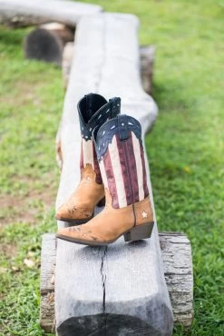 The Keyes boot is an all-American dream. Made with genuine distressed leather for a great look and showcases the classic red, white and blue colors of Old Glory herself. Touches of star-shaped underlays throughout. Also features a snip toe and cowboy heel.