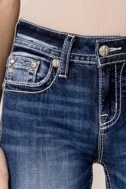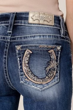 Mid rise dark wash bootcut detailed with hand sanding, embroidered horseshoe and floral design, and a 5 pocket with rhinestone rivets.