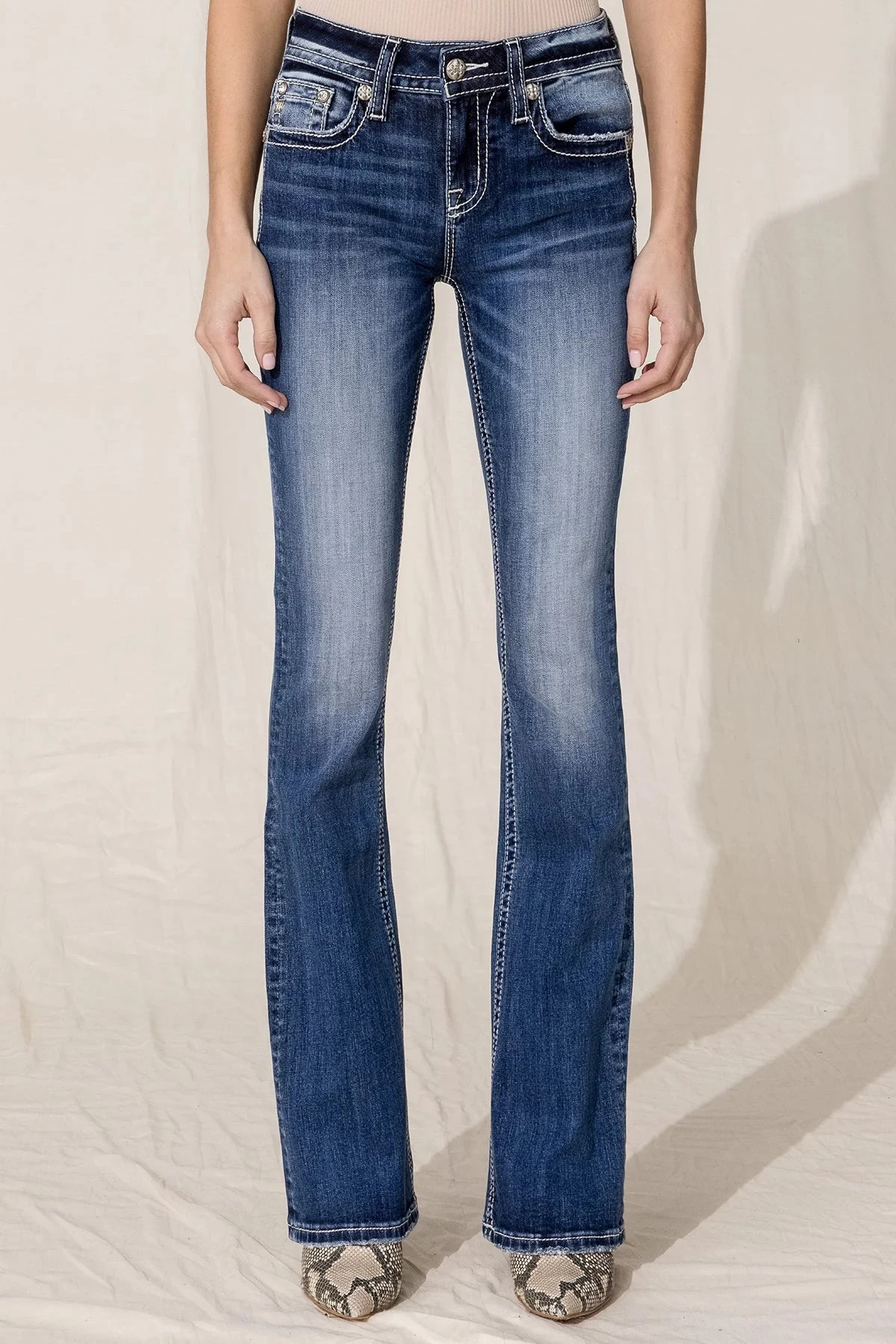 Mid rise dark wash bootcut detailed with hand sanding, embroidered horseshoe and floral design, and a 5 pocket with rhinestone rivets.