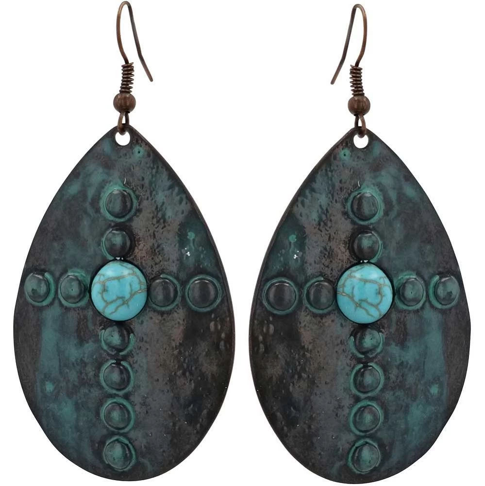 Thoughtful design gives a big impact with these Defender of Faith Attitude Earrings. Turquoise antiqued bronze shields display a cross design with a turquoise gem in the middle. These earrings serve as a reminder of the beauty and strength of faith. These shields dangle from bronze French hooks.
