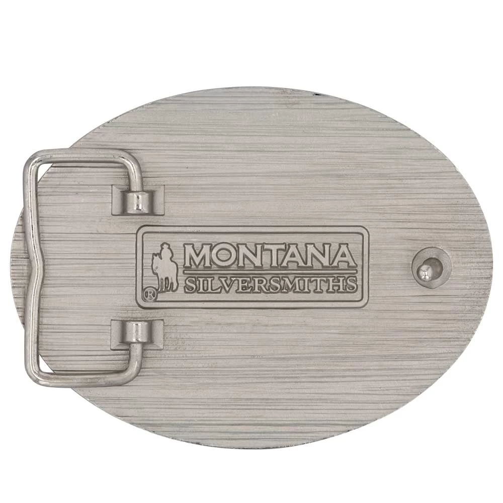 In collaboration with Ted Stovin and his company Cowboy Sh*t, Montana Silversmith created an Attitude buckle that holds one of the truest statements. It is oval-shaped and antique silver-toned with etched roped trim. In the center, the statement “The World Needs More Cowboy Sh*t” sits, surrounded by filigree and western banners. Standard 1.5 inch belt swivel.