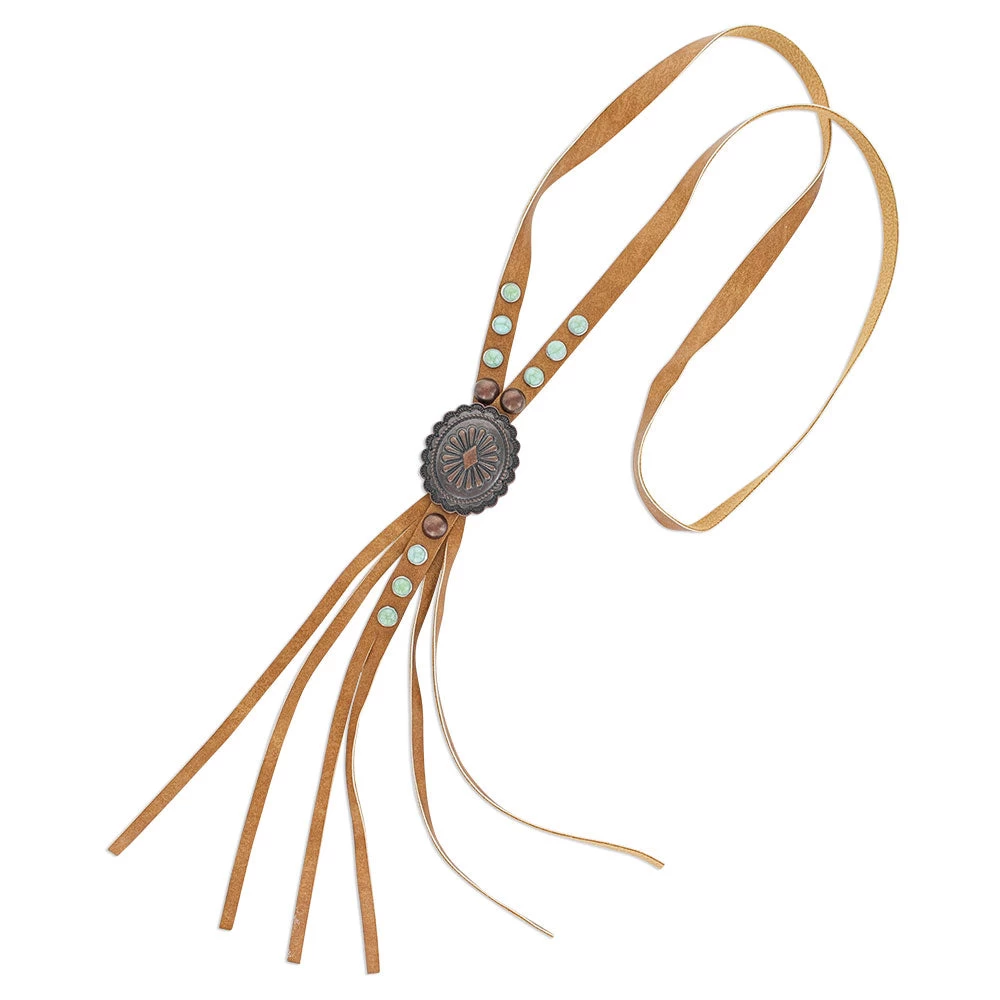 This Attitude necklace is, dare we say – *almost* – a modern, feminine take on the bolo tie? Fawn-colored leather drapes down to diagonally hold a bronze-toned stamped brooch. Above the brooch on both sides lay three turquoise and one rust-colored gem. Below the brooch lies three more turquoise gems and one rust-colored. Below are some additional hanging pieces of leather for an added western vibe. Necklace hangs 32″ long.
