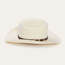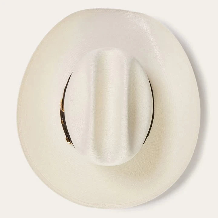 The Evilla de Oro Shantung Cowboy Hat is constructed of 1000X quality shantung straw and features 3BU 2X2 weave, satin/mesh lining and wide roan leather buckle accented hat band.
