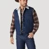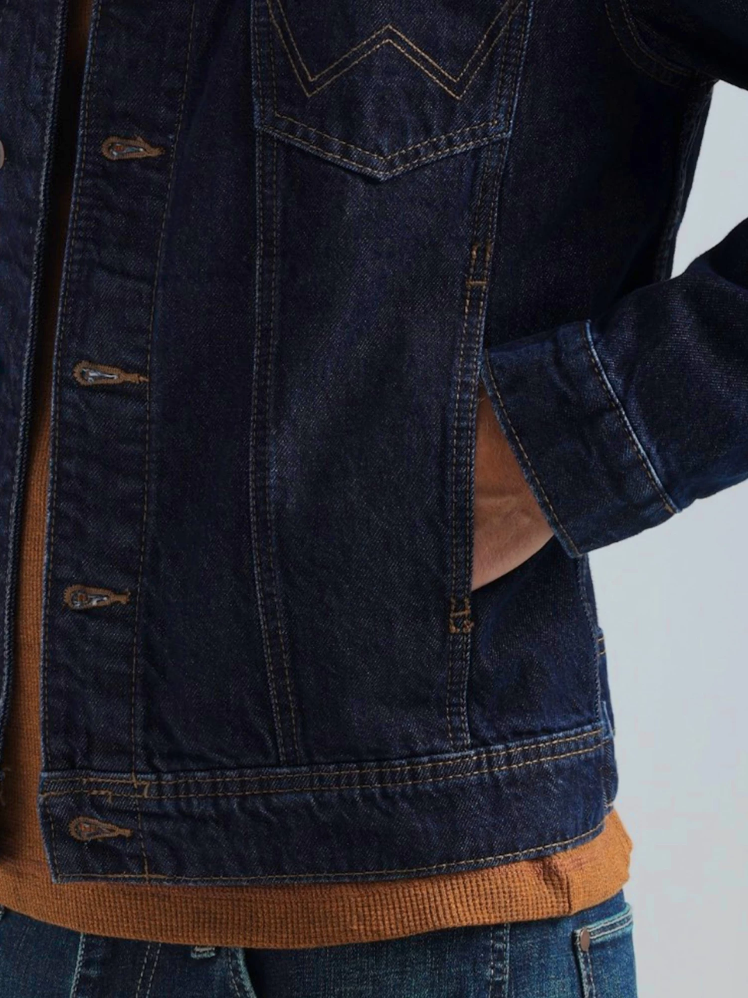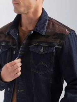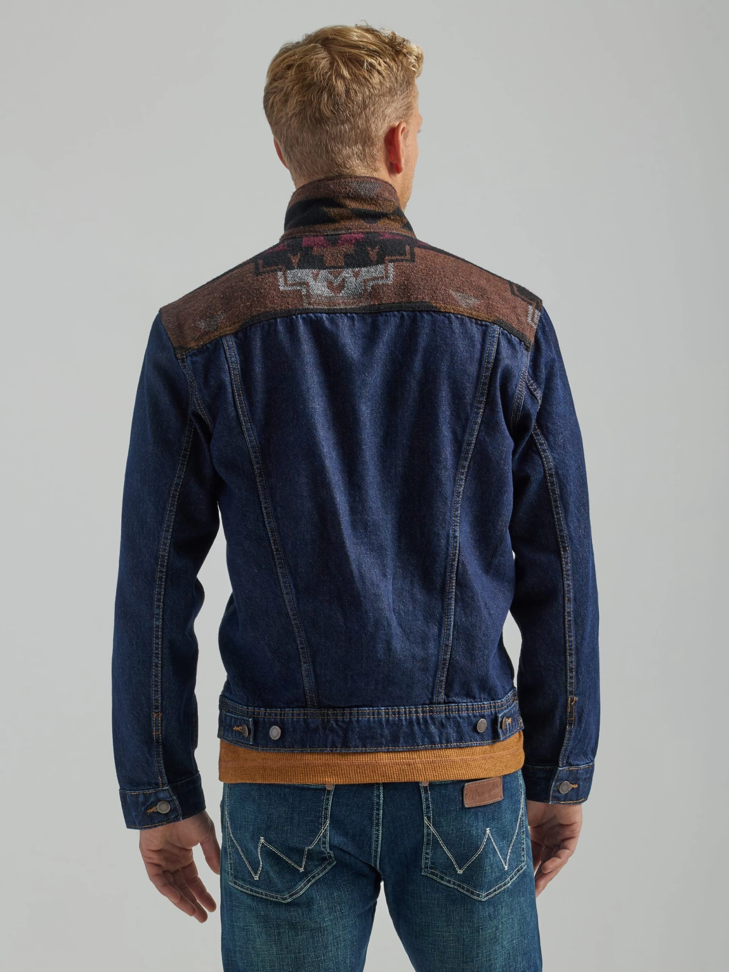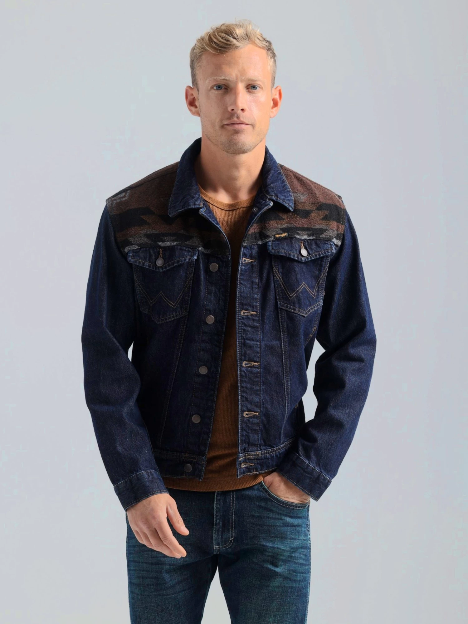 WRANGLER MENS CONTRAST SOUTHWESTERN YOKE UNLINED DENIM JACKET – PECAN PIE