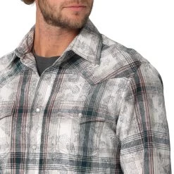 WRANGLER MENS RETRO PREMIUM LONG SLEEVE SNAP OVERPRINT – WHITE GRAY